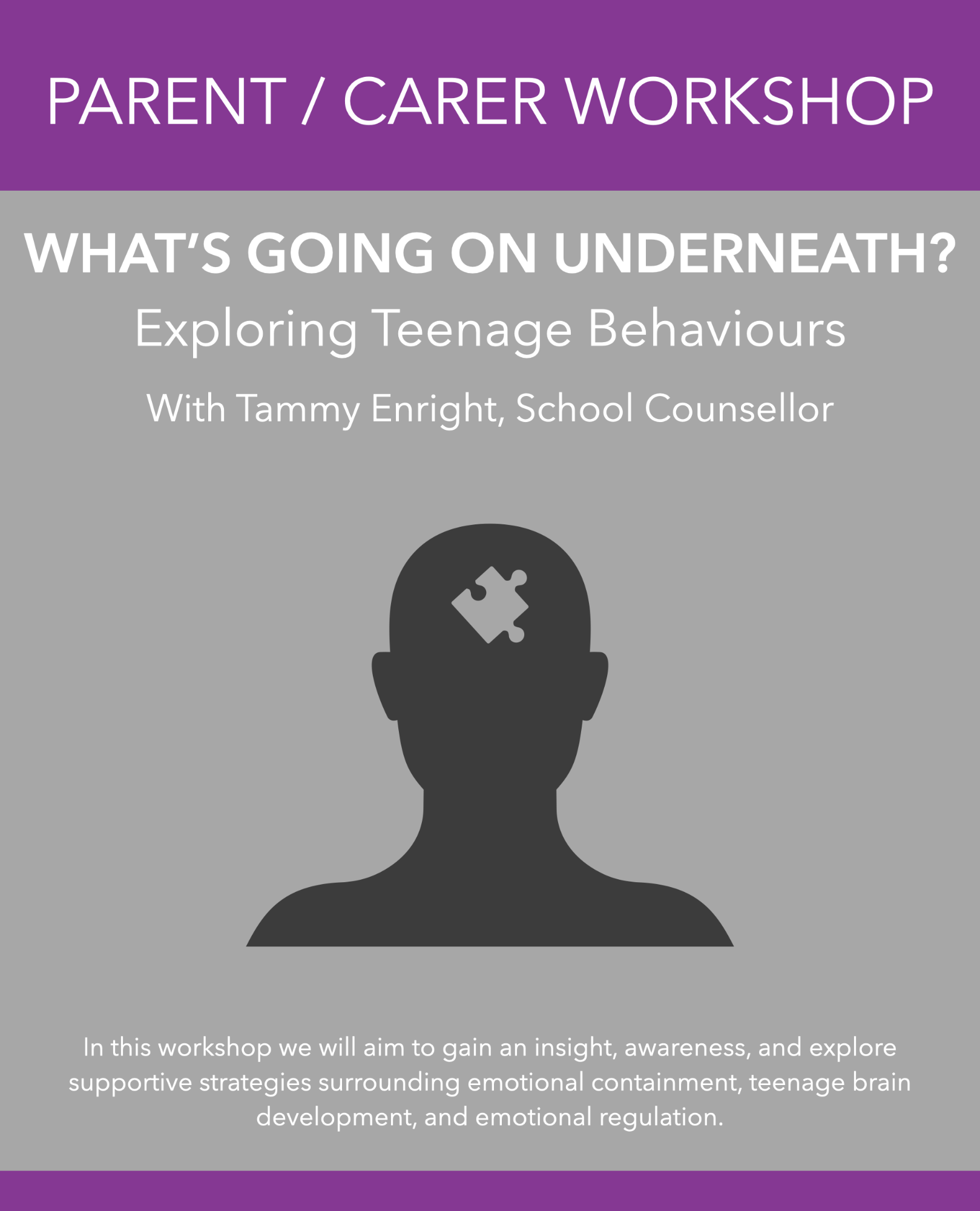 In this workshop we will aim to gain an insight, a deeper awareness and explore supportive strategies surrounding: